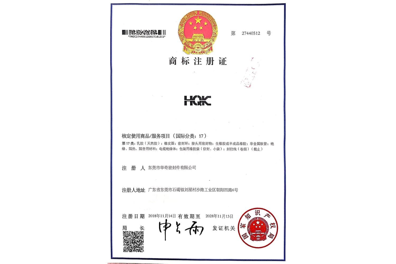 HQK商標注冊證